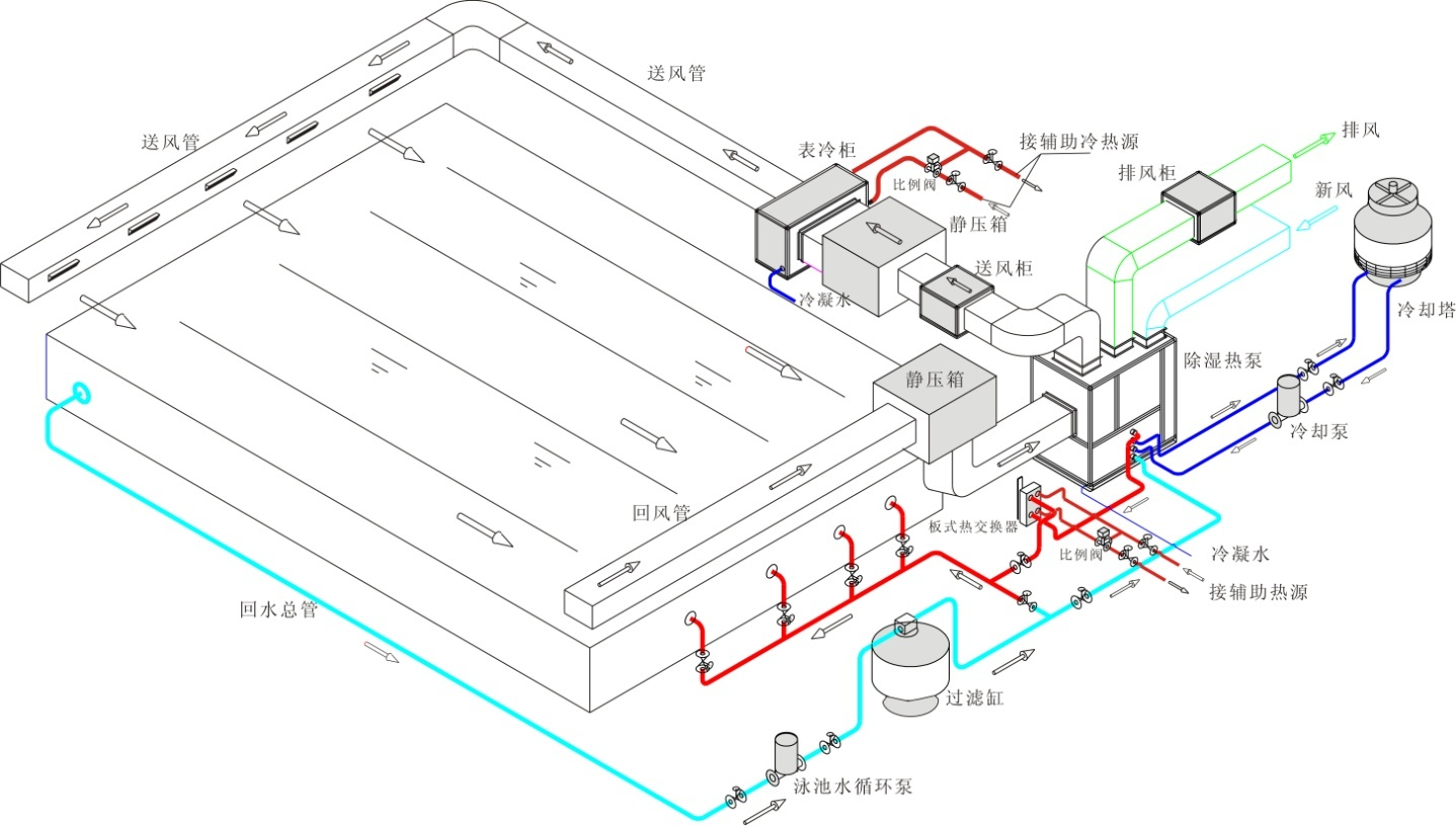 - 設(shè)置通風(fēng)換氣(新風(fēng))功能,充分保持室內(nèi)空氣質(zhì)量;機(jī)組設(shè)置能量回收裝置,可保持冬季排風(fēng)熱回收及夏季排風(fēng)的冷回收,充分節(jié)約運(yùn)行費(fèi)用;且通過新風(fēng)/排風(fēng)風(fēng)量,維持室內(nèi)負(fù)壓,防止泳池間空氣流失及影響周邊環(huán)境;