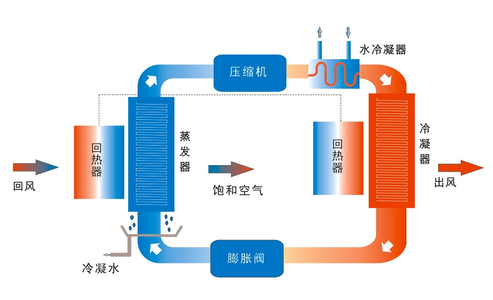 泳池除濕熱泵回?zé)嵫h(huán)是在除濕熱泵機內(nèi)增加回?zé)崞?,使進入蒸發(fā)器的空氣溫度下降而進去冷凝器的空氣溫度上升;回?zé)嵫h(huán)使蒸發(fā)器冷量用于空氣降溫減少(無效耗冷過程),而用于降溫除濕過程冷量增加,使熱泵干燥的最佳蒸發(fā)溫度及最佳除濕量上升;增加回?zé)嵫h(huán)的除濕熱泵是比普通泳池除濕熱泵是40%以上;